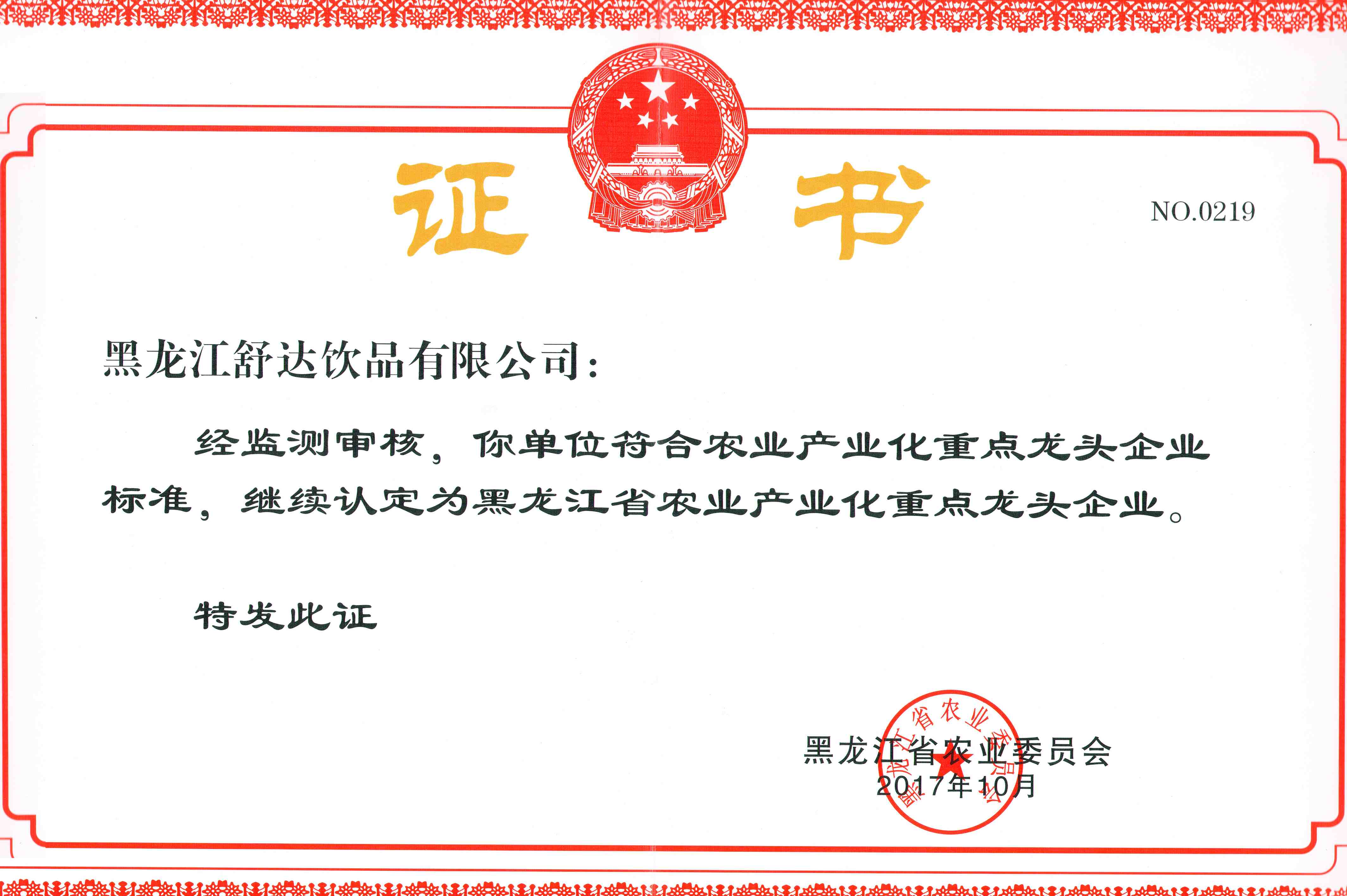2017年 荣获“黑龙江省农业产业化重点龙头企业”称号 |