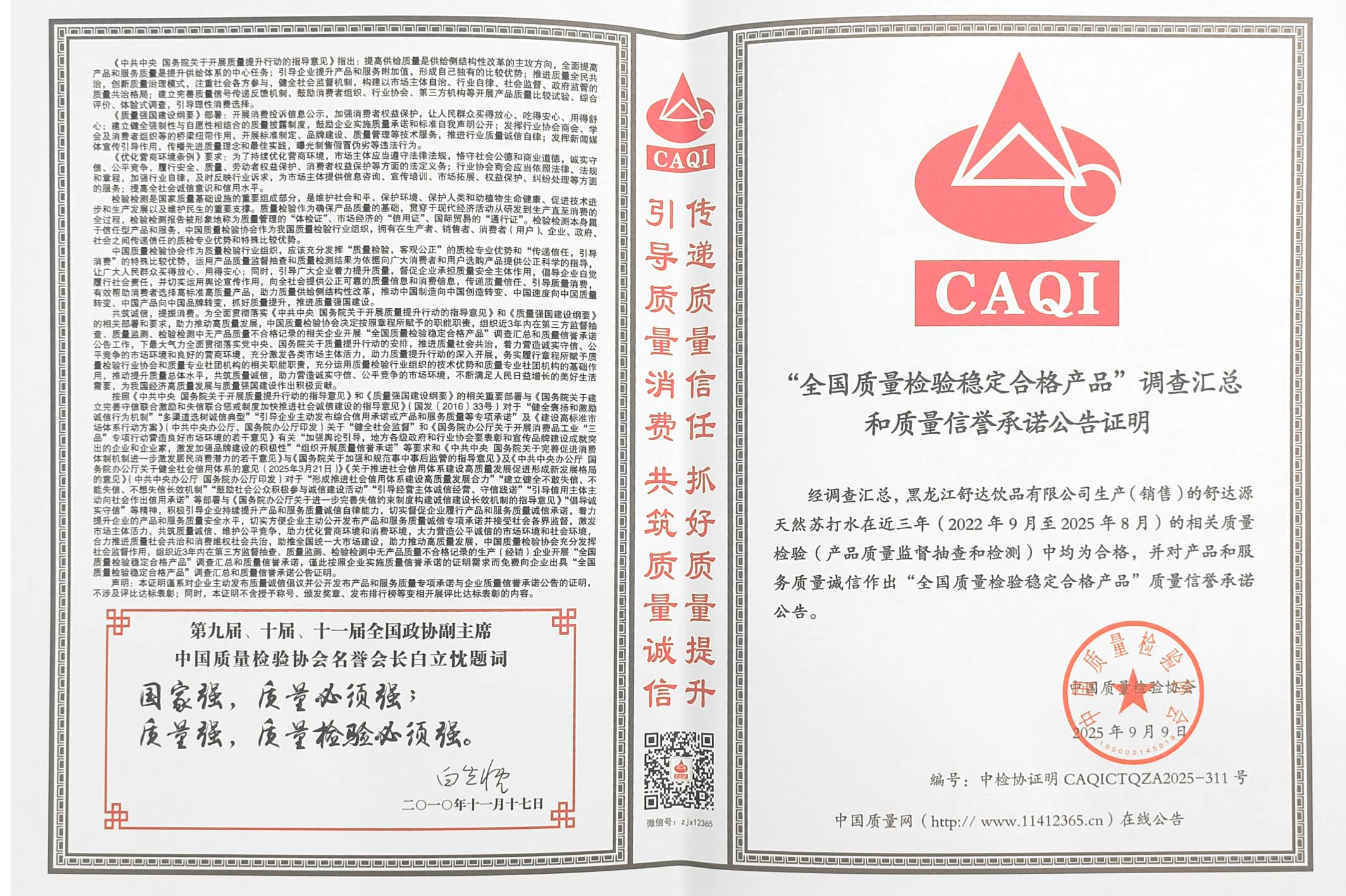2025年 连续10年荣获“315中国质量检验协会”颁发质量领先企业认证 |